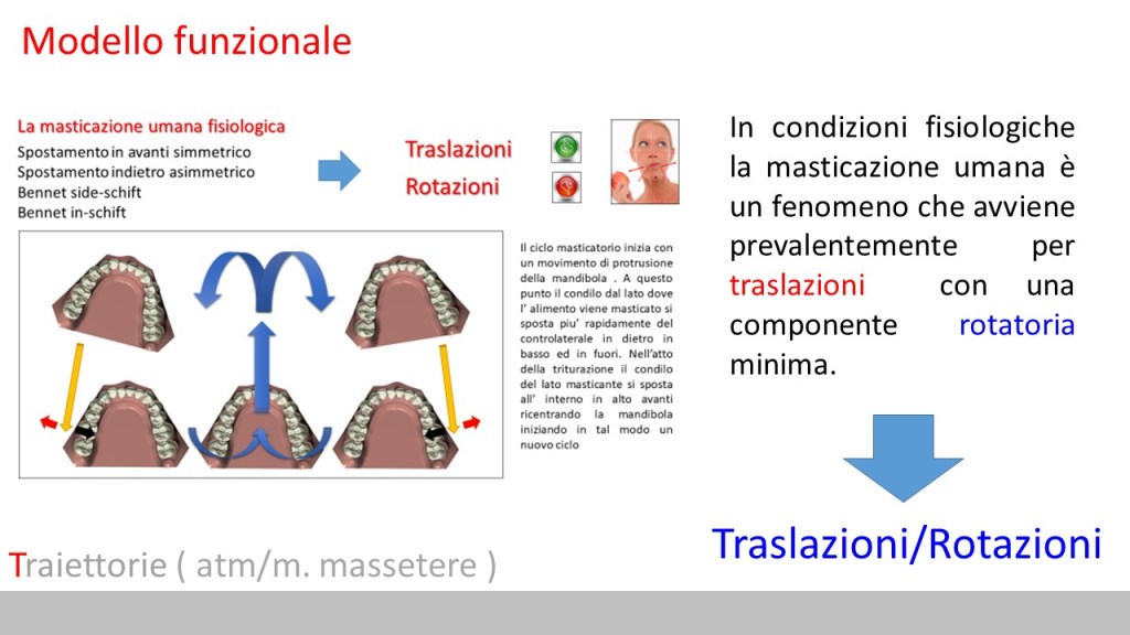 1) Il modello fisiologico di riferimento prevede un ciclo masticatorio bilaterale alternato di tipo traslante con componente rotatoria minima. Ciò consentirà la triturazione degli alimenti e non la loro compressione o schiacciamento.