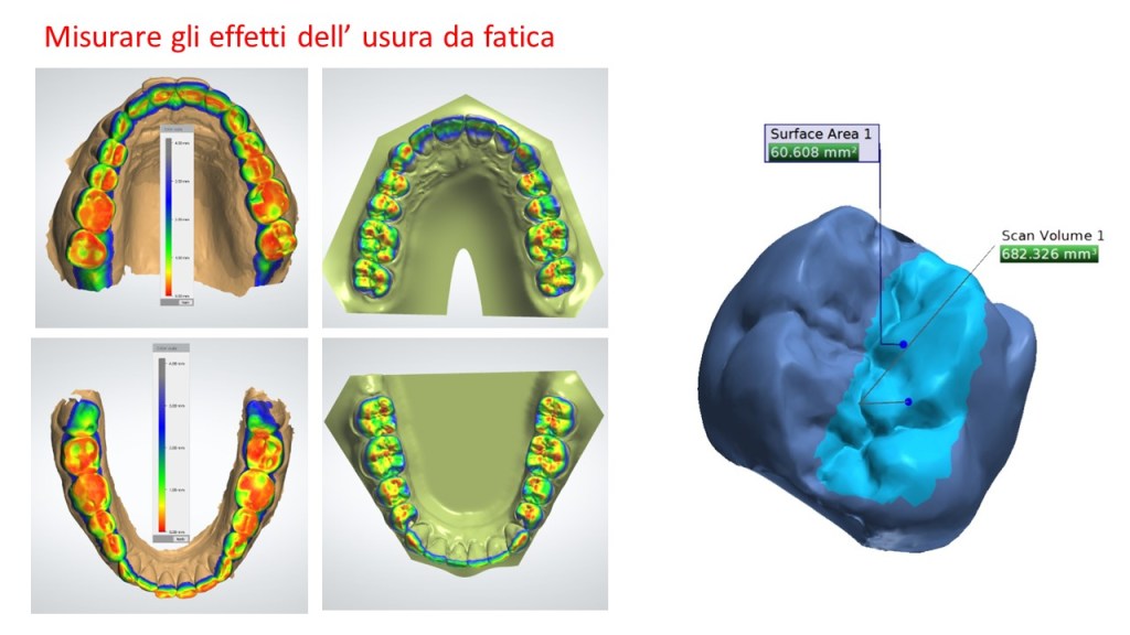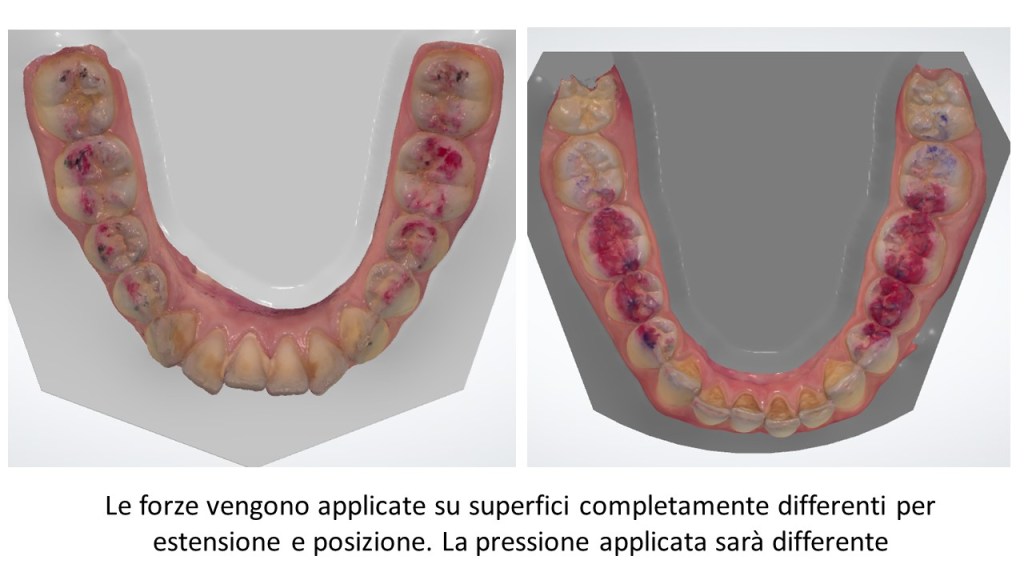 Terminata la masticazione dei marker occlusali se eseguiamo una scansione delle arcate dentali otteniamo queste modelli che ci mostreranno su quanti e quali elementi si svolge l’ attività masticatoria nella fase terminale del ciclo quando entrano in gioco le coppie dentali meglio ” attrezzate ” a tal fine.