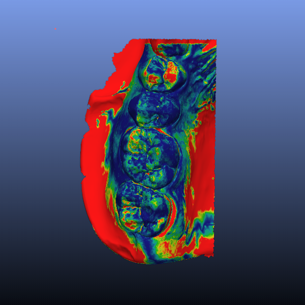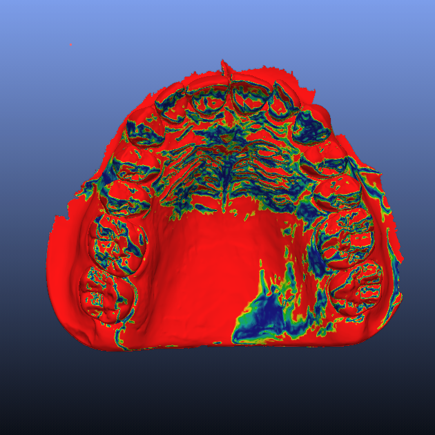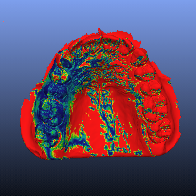 - L’ immagine è ottenuta allineando due mesh ottenute per scansione del modello di una arcata dentale. In blu i punti per i quali la discrepanza è pari a zero micron , in rosso i punti per i quali la discrepanza e compresa entro 50 micron.